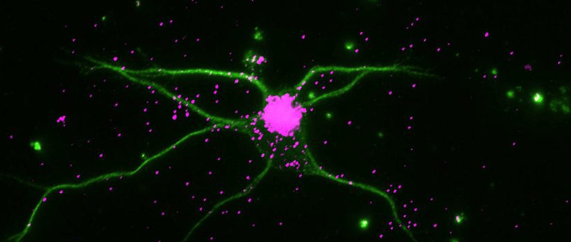 • Fluorescent microscope image showing a neuron in green with branching dendrites and clustered magenta protein markers, highlighting neural connections and synaptic activity in a research study.